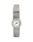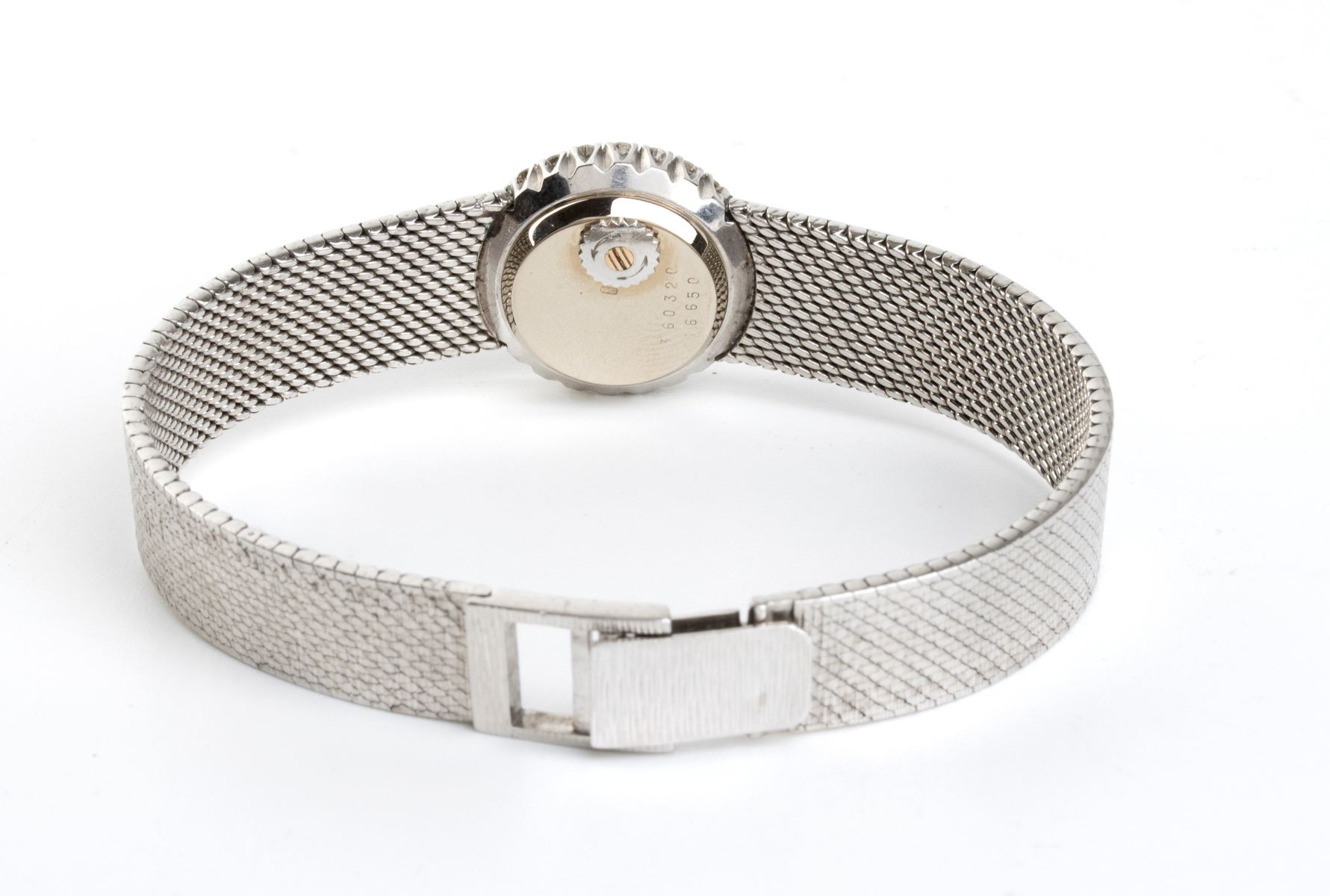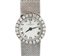 cassa in oro bianco 18k con cinturino integrato in oro bianco, quadrante bianco con numeri romani e contornato da diamanti. Movimento meccanico a carica manuale con corona sul fondello.