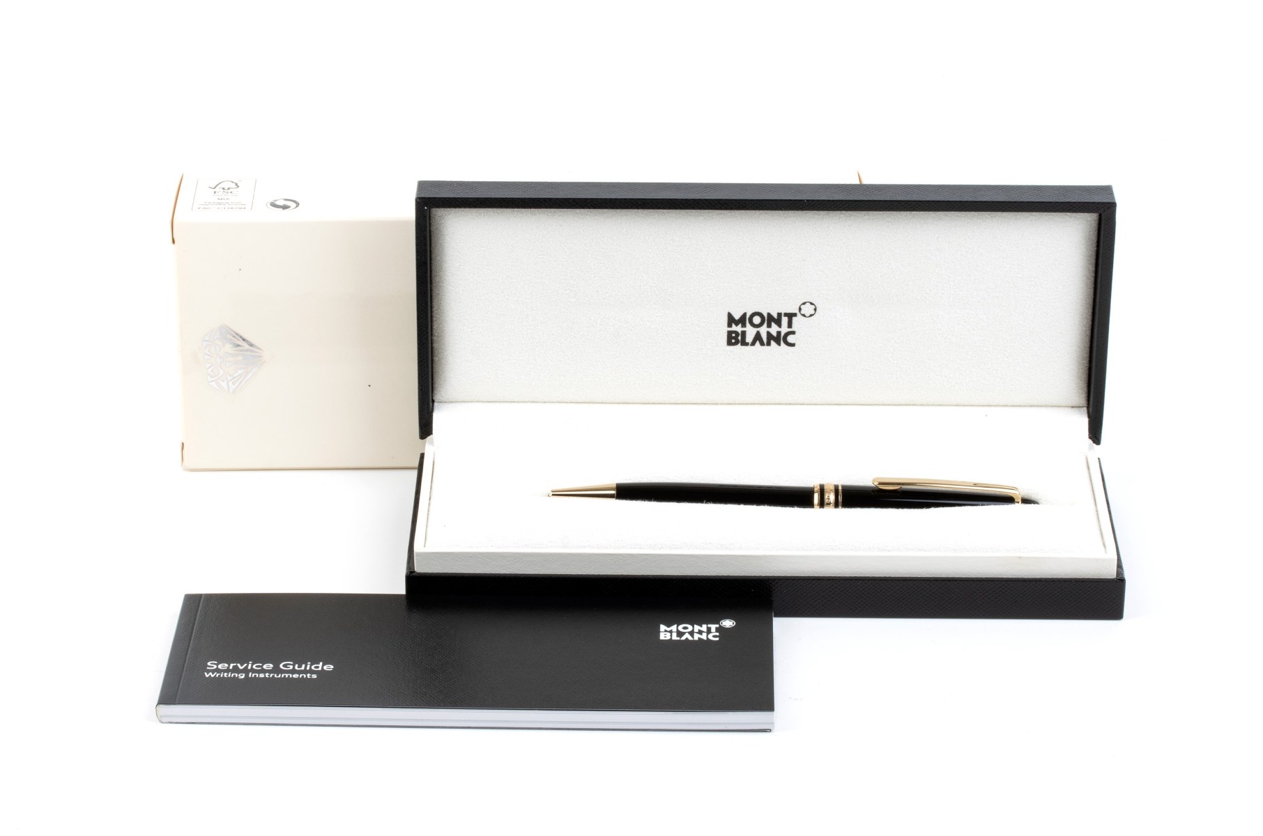 Corpo in pregiata resina nera, stella bianca Montblanc intarsiata, finiture e clip dorate. Scatola e controscatola Montblanc.