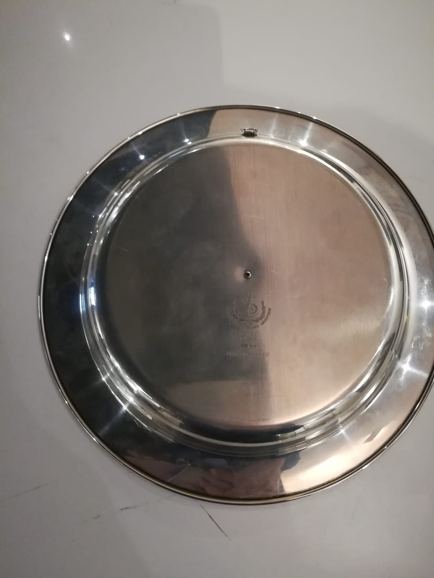 STEFANI MAESTRI ORAFO ARGENTIERI, XX secolo. Fondina dal titolo “Tre piccole Grazie” firmata e numerata, esemplare n. 74 di 199. Argento 800 con dorature in oro 24 Kt., smalti a fuoco e pietre dure. Reca sotto la base marchio, tecnica e punzoni. Firma incisa sotto la base Ale Stefani. Peso complessivo 317 gr., diametro cm. 22.