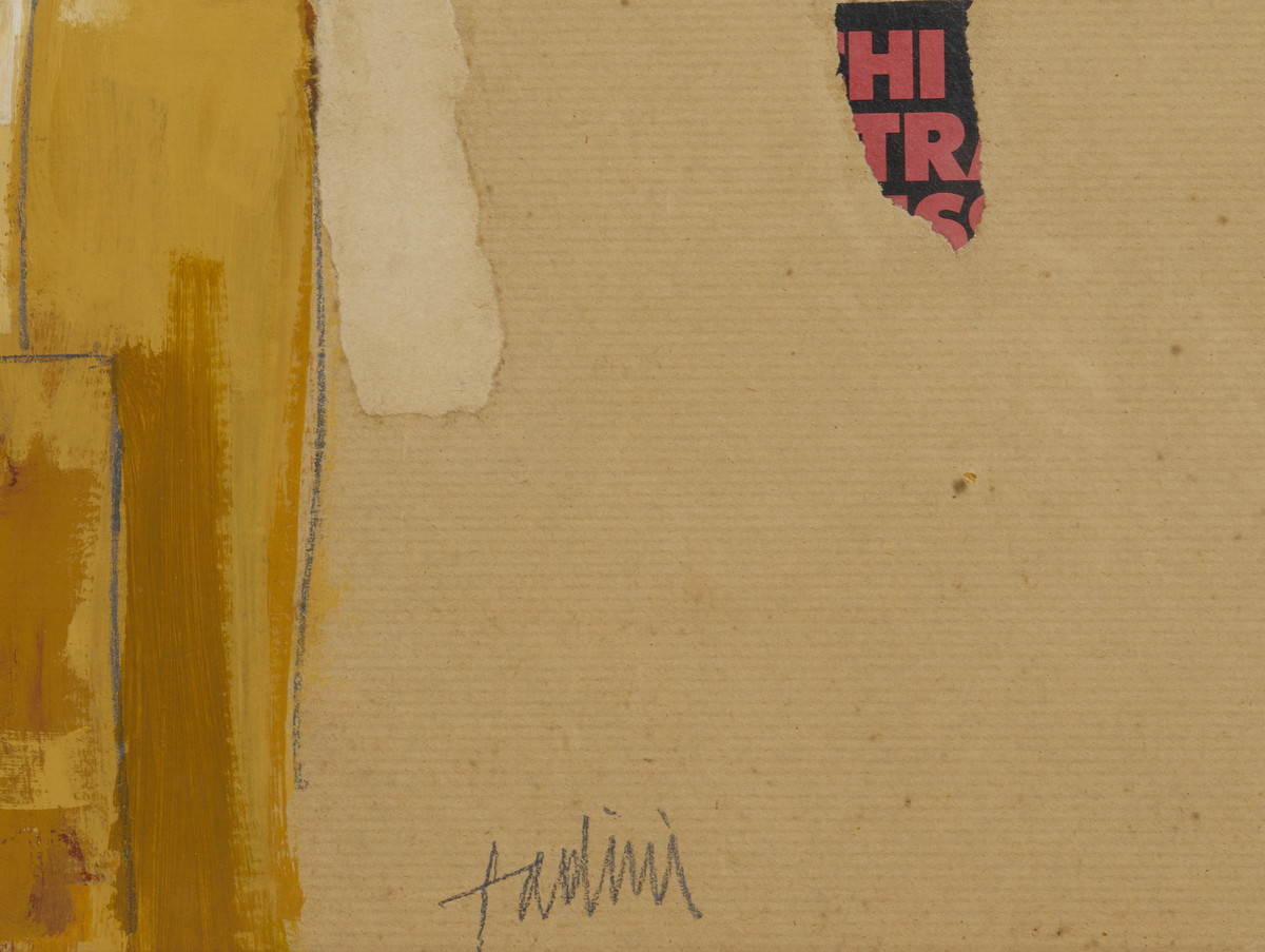 TADINI EMILIO (1927 - 2002) SENZA TITOLO, 1998-1999. matita, colori acrilici, collage su carta da pacco. Cm 52,50 x 75,00. firma
