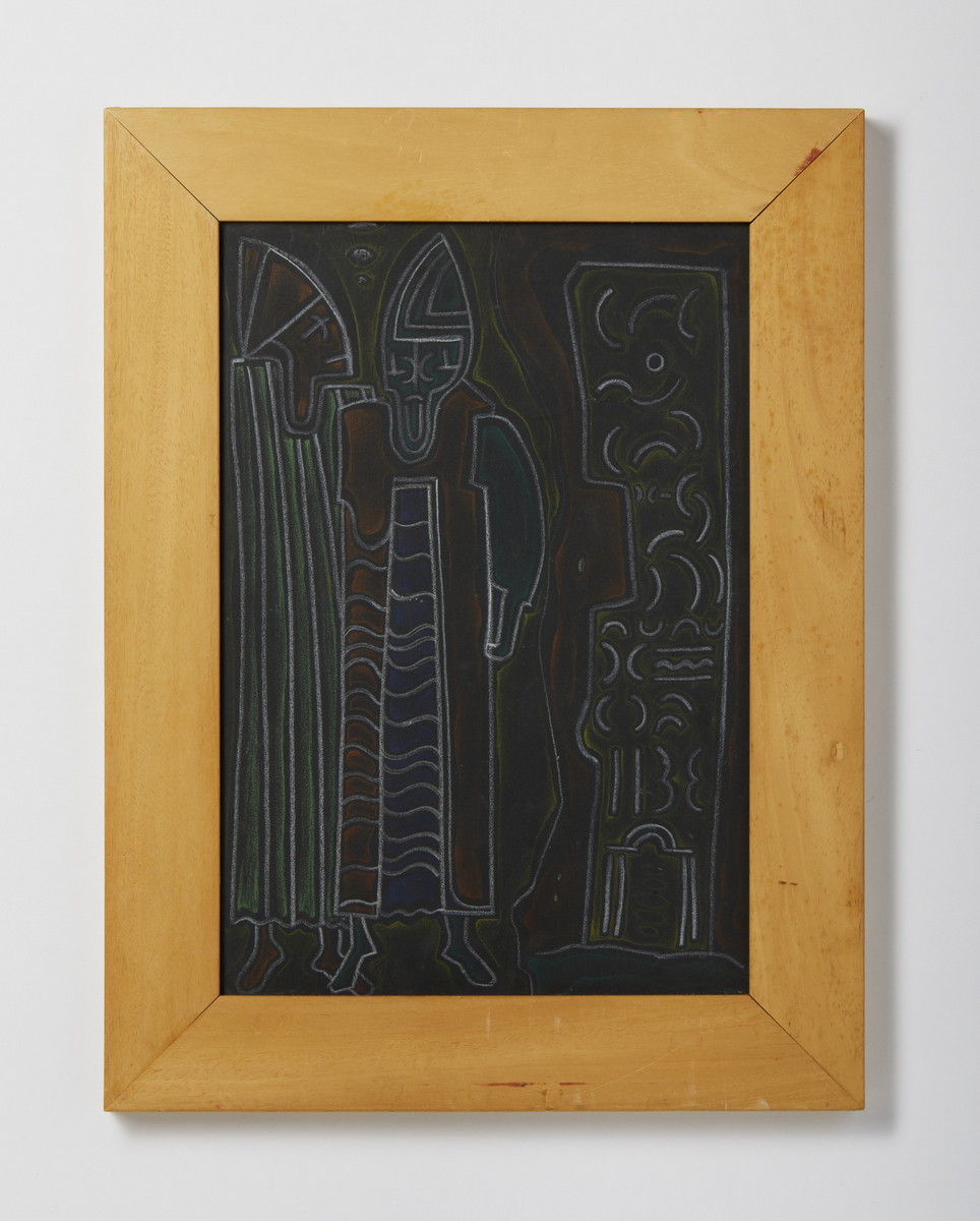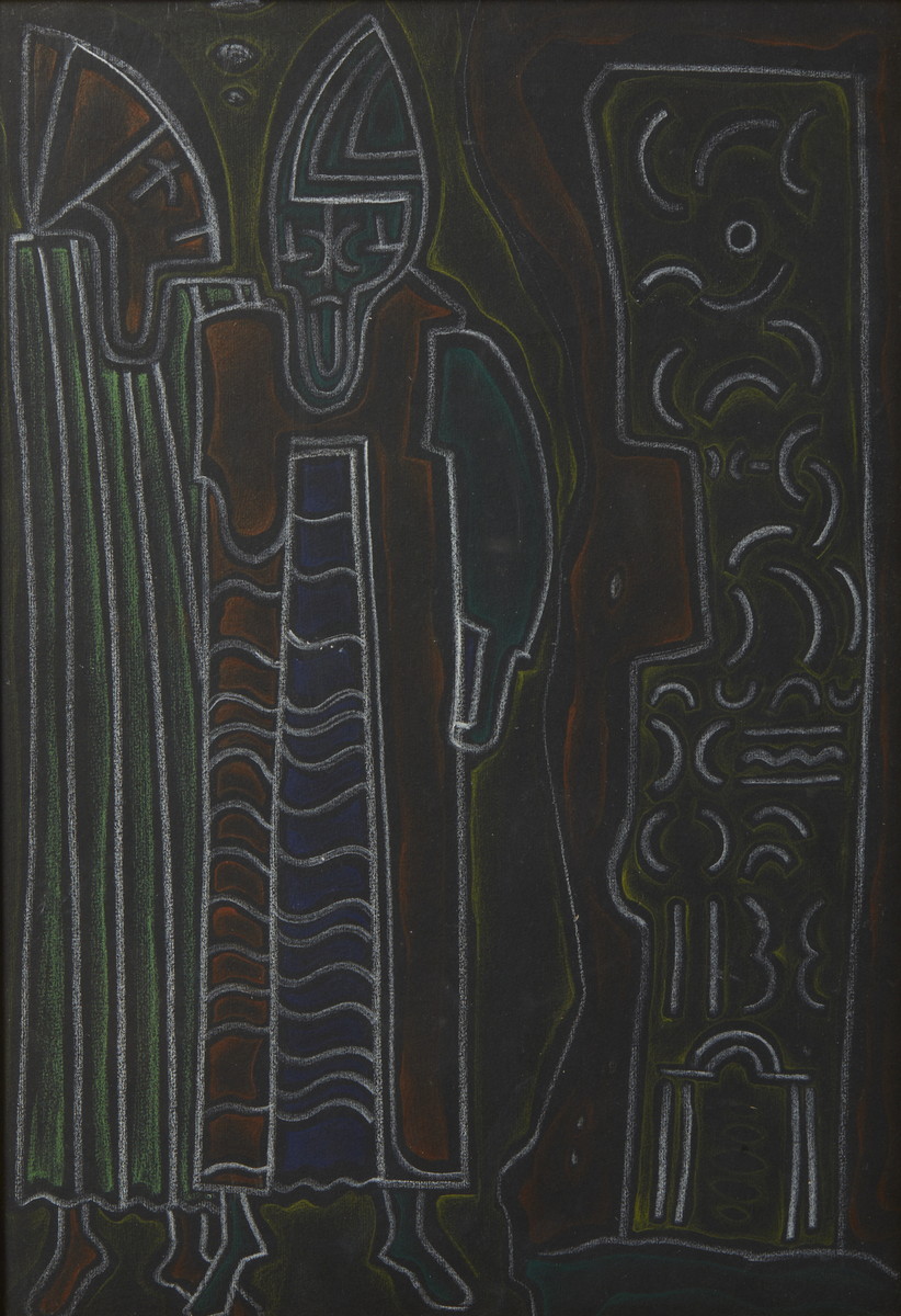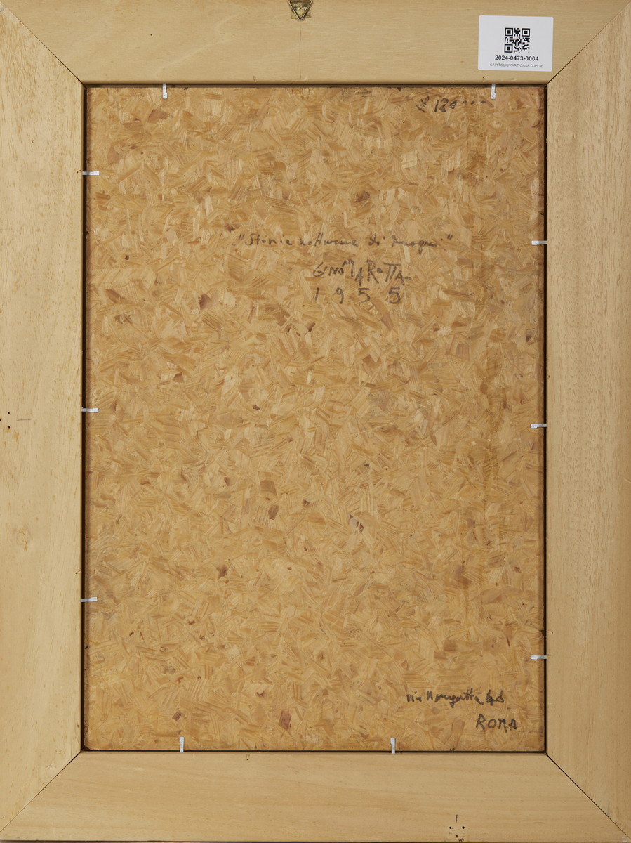 MAROTTA GINO (1935 - 2012) STORIA NOTTURNA DI ANAGNI, 1955. pastello su cartoncino applicato su tavola. Cm 33,00 x 47,50. sul retro: titolo, firma e data. Cornice presente
