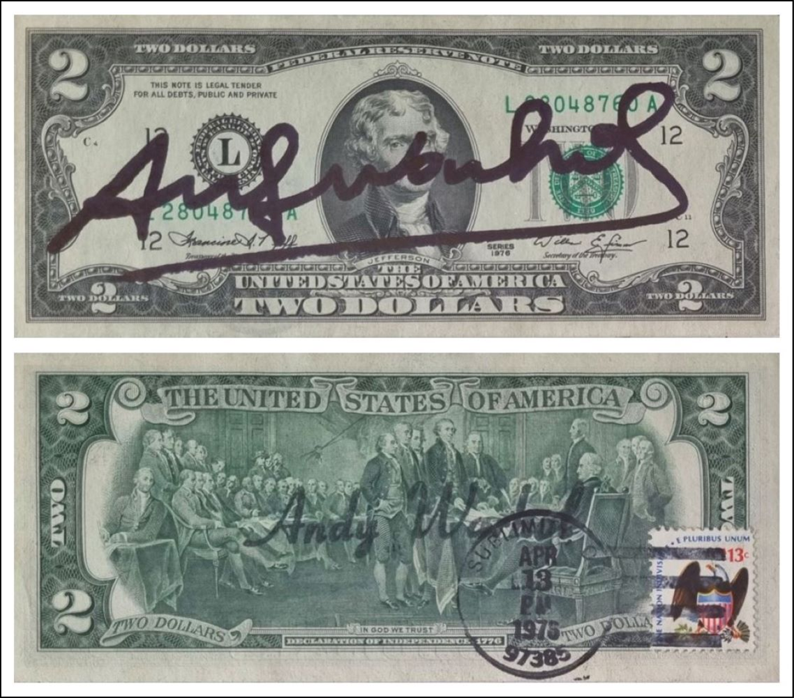 WARHOL ANDY Pittsburgh 1928 - New York 1987 "2 Dollars - L28048760A" Banconota da 2 dollari recante sul fronte firma autografa dell'Artista. Sul retro francobollo e timbro postale USA del 13 aprile 1976, oltre timbro della "Factory Warhol". Dimensioni mm 155,955x66,294 come riportate su certificato di autenticità ed unicità dell'esemplare, emesso da GALERIE 32 - Nizza. Opera contenuta in espositore in plexiglass.