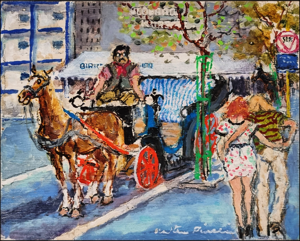 PIACESI WALTER Ascoli Piceno 1929 - Fermignano 2022 "Nei pressi del vecchio Kursaal" Olio su tavola cm 25x20, del 2008. Firmato sul fronte in basso a destra. Sul retro titolo, firma, tecnica, numero di archivio ed etichette e timbri per provenienza. Autentica ed archiviazione su foto.