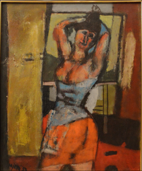 PAJETTA GUIDO Monza 1898 - Milano 1987 "Donna che si esibisce" Olio su tela cm 50x60 del 1955. Firmato e datato sul fronte, in basso a sinistra, al verso timbro e numero d'archivio. Autentica ed archiviazione su foto a cura dell'Archivio Pajetta. Certificato di autenticità e garanzia a cura di Elite Shopping TV. Opera pubblicata sul Vol. I del Catalogo Ragionato dei Dipinti 1914-1963, a pag. 484.