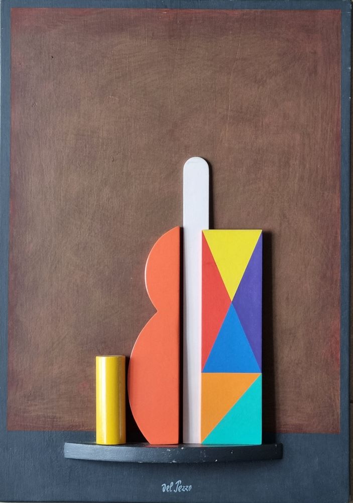 DEL PEZZO LUCIO Napoli 1933 - Milano 2020 "Mensola policroma" Tecnica mista, collage, colore acrilico e smalto su tavola cm 35x50. Firma sul fronte in basso al centro. Al retro firmata ed intitolata. Certificato di garanzia ed autenticità della Fidesarte (VE), su foto. Certificato di garanzia di altra casa d'aste.