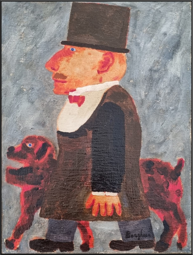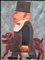 BORGHESE FRANZ Roma 1941 - 2005 "Personaggio con cane" Olio su tela cm 30x40. Firmato sul fronte in basso a destra, e sul retro. Certificato di autenticità e archiviazione su foto a cura dello Studio Franz Borghese Santerasmo.