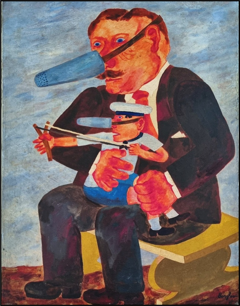 BORGHESE FRANZ Roma 1941 - 2005 "L'infanzia di Giacomo" Olio su tela cm 70x90. Firmato sul fronte in basso a destra. Sul retro firma per autentica, timbro della galleria "Il Gianicolo" e titolo. Certificato di autenticità e archiviazione su foto a cura dell'archivio generale Studio Franz Borghese Santerasmo.