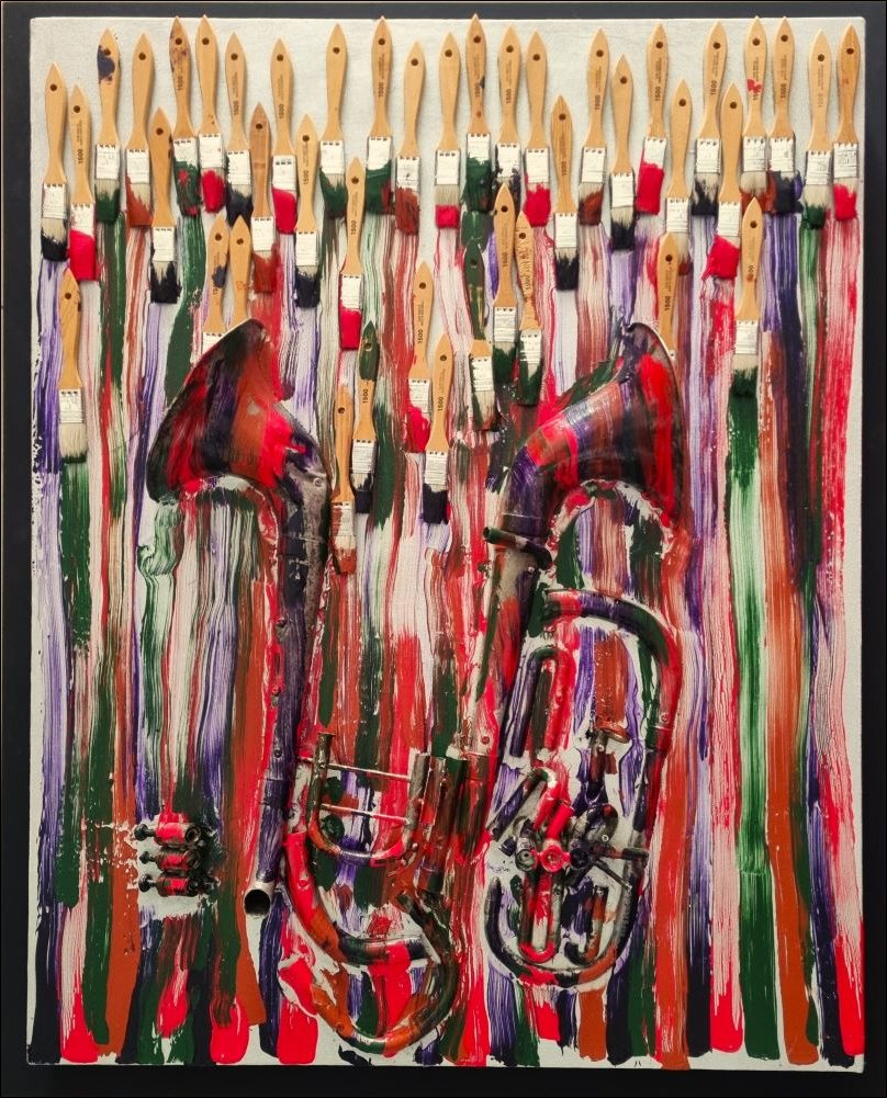 FERNANDEZ ARMAN - ARMAND PIERRE Nizza 1928 - New York 2005 "Senza titolo" Olio, pennelli e strumento musicale applicati su tela, cm 81x102, del 2003. Opera contenuta in teca di plexiglass. Al retro etichetta descrittiva e timbri della Galleria Bugno ed etichetta "Arman Studio New York". Opera registrata presso l'Archivio generale per l'opera di Arman - Parigi. Certificato di autenticità a cura di Bugno Gallery. Autentica su foto a cura del Maestro. Archivio su foto a cura dell'Archives Denyse Durand-Ruel.
