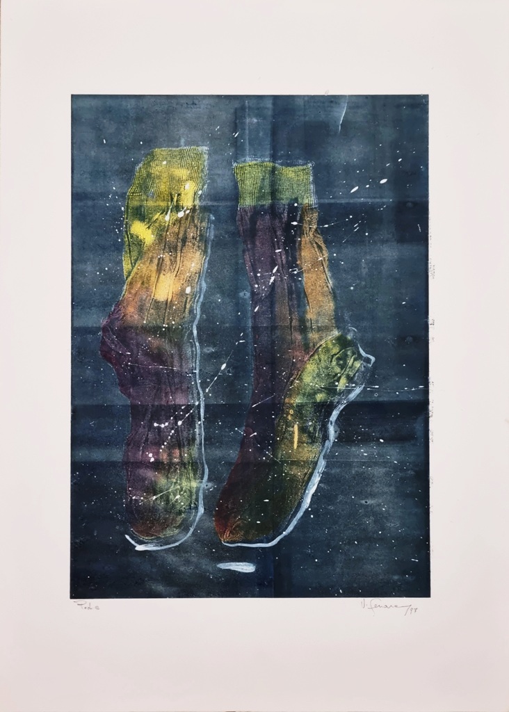 FERRARA VINCENZO Potenza 1961 "Calzini" Calcografia al torchio colorata a mano cm 50x70. Firmata e datata sul fronte in basso a destra, tiratura P.A. a sinistra.