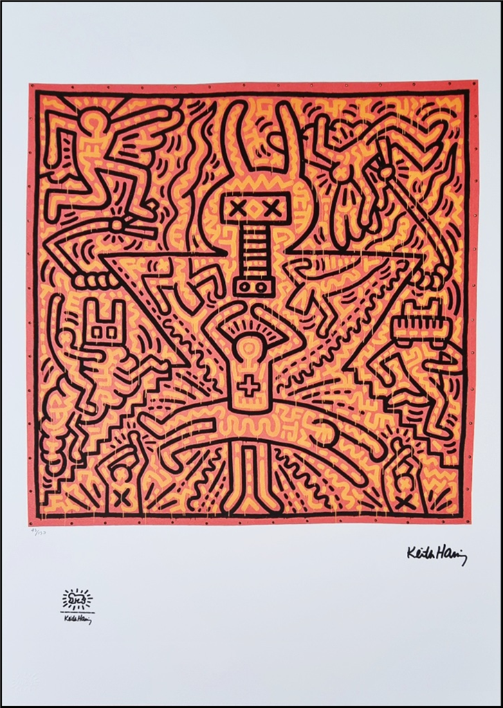 HARING KEITH Pennsylvania 1958 - New York 1990 "Senza titolo" Riproduzione litografica offset cm 50x70. Firma in stampa sul fronte in basso a destra, tiratura 43/150, timbro a secco e timbro in stampa a sinistra.