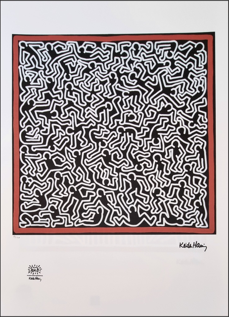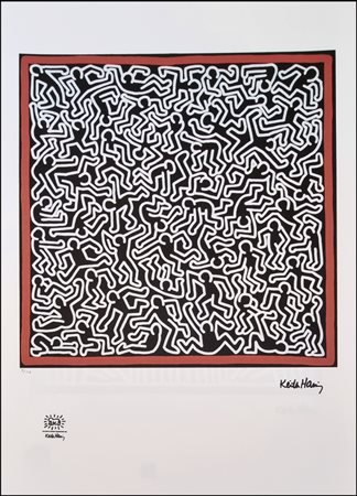 HARING KEITH Pennsylvania 1958 - New York 1990 "Senza titolo" Riproduzione litografica offset cm 50x70. Firma in stampa sul fronte in basso a destra, tiratura 81/150, timbro a secco e timbro in stampa a sinistra.