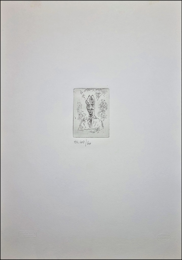 CARRA' CARLO Alessandria 1881 - Milano 1966 "Ritratto di gentiluomo" Incisione acquaforte originale cm 50x35 (foglio), cm 7,50x9,50 (incisione), del 1922. Tiratura 49/60 a sinistra. Sul retro timbro a secco e timbro per autentica a cura di Massimo Carrà. Certificato di garanzia a cura di Edi-Grafica Nuova.