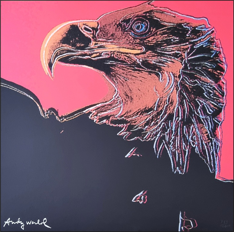 WARHOL ANDY Pittsburgh 1928 - New York 1987 "Eagle" Riproduzione litografica offset su cartoncino cm 60x60. Firmata in stampa sul fronte in basso a sinistra, tiratura a matita 283/2400 in basso a destra. Sul retro timbro Edizioni CMOA e ologramma.