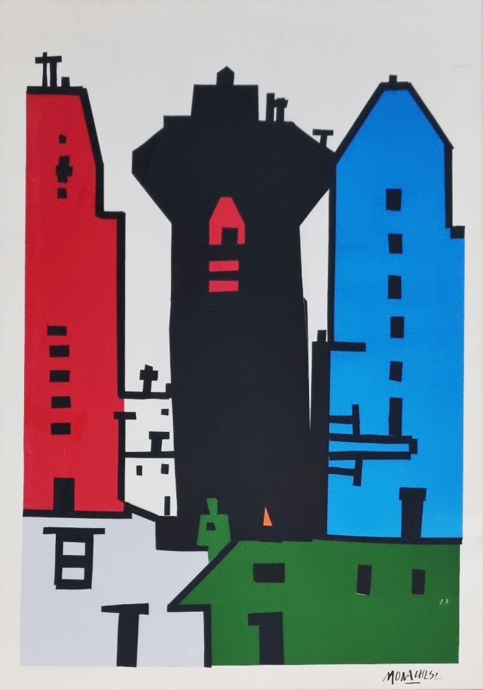 MONACHESI SANTE Macerata 1910 - Roma 1991 "Senza titolo" Serigrafia e collage su carta cm 70x100. Firmata sul fronte in basso a destra.