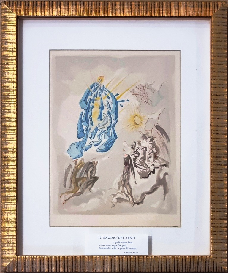 DALI' SALVADOR Spagna 1904 - 1989 "Il gaudio dei beati" Xilografia su carta cm 21x27. Esemplare 1938/2900. Sul retro etichetta descrittiva a cura della Galleria Bottega D'arte (Matera). Tavole ispirate alla Divina Commedia. Opera incorniciata.