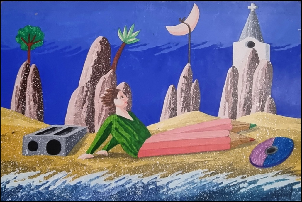 APHEL FABIO Cavalese (TN) 1957 "Il disegnatore sognatore" Olio su tavola cm 30x20. Firmato sul fronte in basso a destra, al verso titolo e firma.