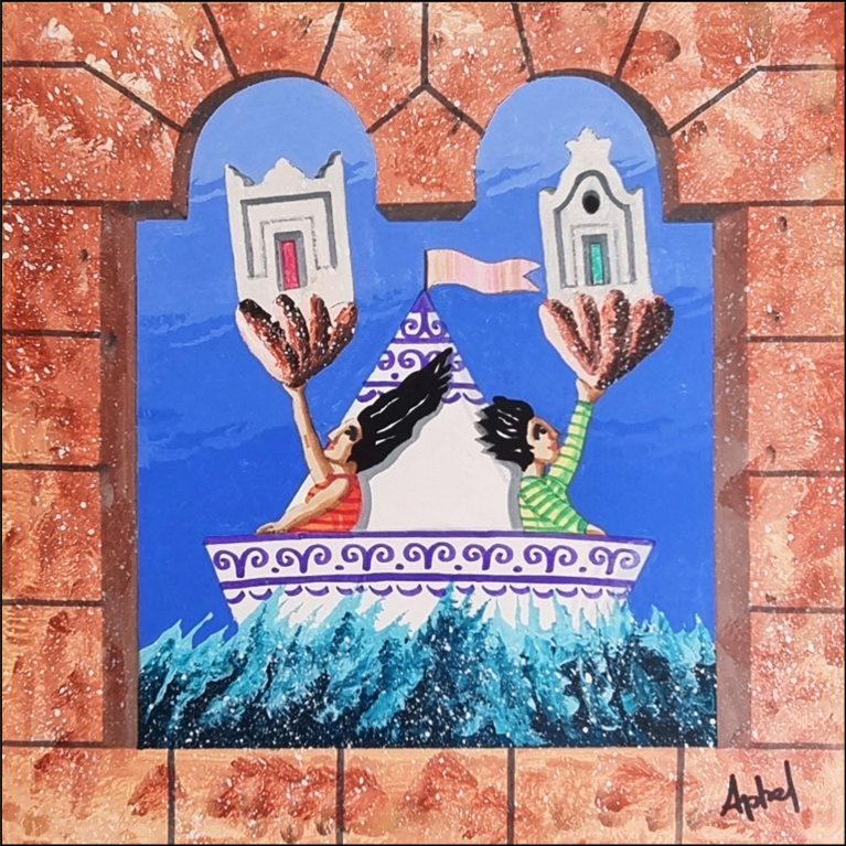 APHEL FABIO Cavalese (TN) 1957 "I separati in barca" Olio su tavola cm 25x25. Firmato sul fronte in basso a destra, sul retro titolo, firma e dimensioni.