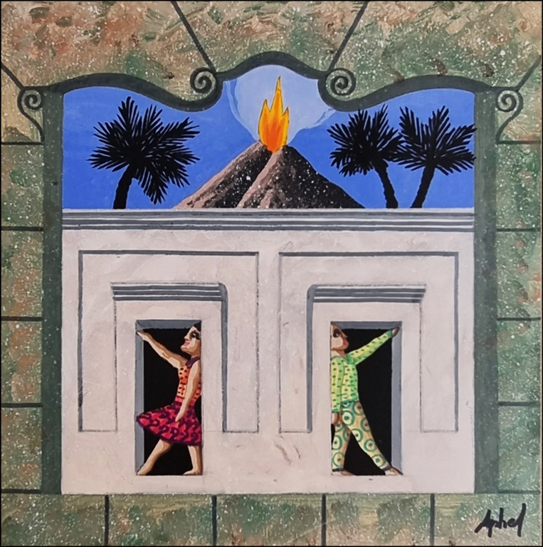 APHEL FABIO Cavalese (TN) 1957 "La coppia vulcanica" Olio su tavola cm 25x25. Firmato sul fronte in basso a destra, sul retro titolo, firma e dimensioni.