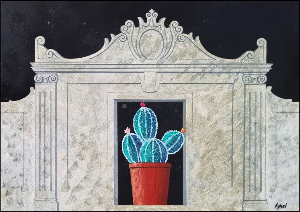 APHEL FABIO Cavalese (TN) 1957 "La casa del cactus" Olio su tavola cm 70x50. Firmato sul fronte in basso a destra. Sul retro titolo, firma e dimensioni.