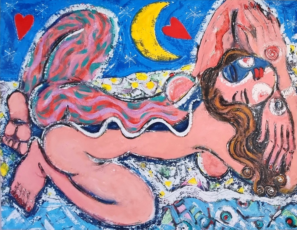 SQUICCIARINI ANTONIO Bari 1957 "La sognatrice" Acrilici e tecnica mista su tela cm 156x120, del 2005. Firmato sul fronte in basso al centro. Al verso titolo e firma per autentica. Autentica dell'Artista su foto.