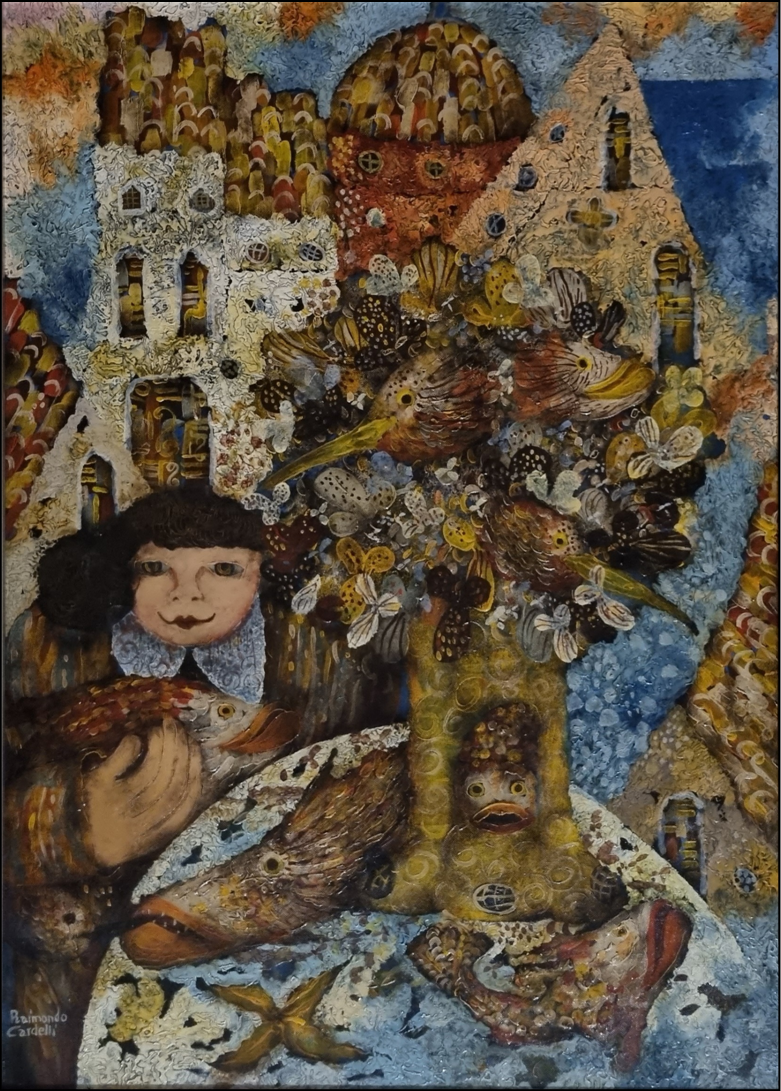CARDELLI RAIMONDO Marsiglia 1938 - Lucca 2008 "Senza titolo" Acrilici e tecnica mista su tela cm 50x70. Firmato sul fronte in basso a sinistra.