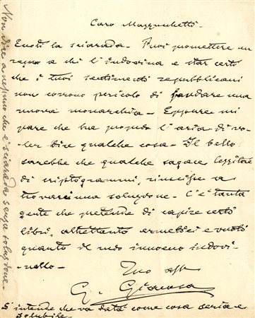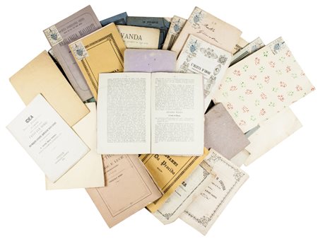 Manoscritti a inchiostro nero. Dimensioni varie. SI AGGIUNGONO: Id.,: 5 lettere, 2 biglietti e 3 composizioni in versi autografe firmate. 3 buste conservate. Datate fine XIX secolo. SI AGGIUNGONO: Id.,: 4 lettere autografe firmate a differenti destinatari. Datate 1872-1905.(20) -