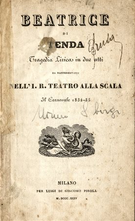 Tra gli autori della musica: Gioachino Rossini, Pietro de Winter, Alessandro Nini, Francesco Petrocini, Alberto Mazuccato, Francesco Sangalli, Gnecco Francesco, Errico Petrella, Giocondo Degola, Francesco Schoberlechner. Di Giuseppe Verdi: Macbeth, Nabucodonosor (1842), Giovanna de Guzman, Giovanna d’Arco, Lombardi alla prima Crociata, La Traviata, Luisa Miller, Il Trovatore. Di Vincenzo Bellini: Norma, I Capuleti e i Montecchi, Beatrice di Tenda, Il Pirata, I Puritani, La Sonnambula, La Straniera. Tra i cantanti: Giovanni Battista Rubini, Domenico Donzelli, Carlotta Ungher, De Baillou Felicita, Enrichetta Meric-Lalande, De Giuli Borsi, Erminia Frezzolini, Marietta Brambilla, Felice Varesi ecc. Con alcuni balli (e i nomi dei ballerini). Libretti pubblicati da Ricordi, Pirola, Fontana, Truffi ecc. Alcuni conservati in legature verdi con timbri a inchiostro di antica appartenenza al frontespizio, altri con brossure originali. Dimensioni varie.(30) -