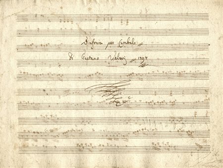Manoscritto musicale. Completo. Partitura d'orchestra. Carte [16]. Il manoscritto è a inchiostro nero su carta a mano con 12 pentagrammi. Conservate anche le parti staccate del Violino Principale, Violino I, Violino II (2 copie), Viole, Clarino I e II, Oboe I e II, Flauto, Corno I e II, Tromba I e II, Fagotto, Basso e Violoncello, Basso II. Al frontespizio il nome dell'antico proprietario. Carte con filigrana molto ben conservate. Dimensioni: 230x330 mm. SI AGGIUNGE: Id.,: Scena e Duetto / Pensa ch'io son Romano […]. Non datato [inizio XIX secolo]. Partitura. Completo.(2) -