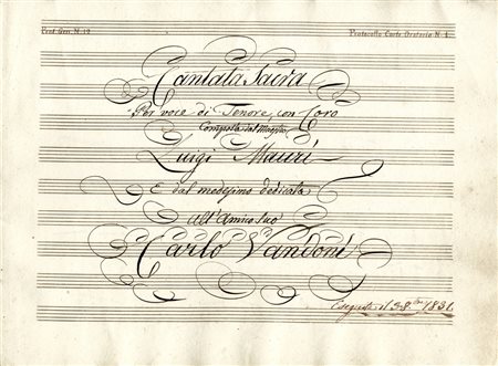 Manoscritto musicale. Completo. Partitura d’orchestra. Carte [16]. Il manoscritto è a inchiostro nero su carta a mano con 10 pentagrammi. La partitura non presenta correzioni, ripensamenti o cancellature. Carte con filigrana molto ben conservate. Dimensioni: 230x330 mm. SI AGGIUNGONO: Id.,: Scena e Duetto / Mira guai lampi orribili […] / In Venezia. [Inizio XIX secolo]. Partitura d'orchestra - Scena e Duetto / Al mio dolce e vivo ardore [da I riti d'Efeso] [Inizio XIX secolo]. Partitura d'orchestra - Duetto / Rendi lo sposo amato / aggiunto ed inserto nel Dramma di Teresa e Claudio […]. [Inizio XIX secolo]. Partitura d'orchestra - Duetto / Al mio dolce e vivo affetto / […] / Eseguito dalla Sig.r Banti ed'al [sic!] Sig.r Tramesani [Tramezzani] / Nel Nuovo Teatro la Fenice il Carnovale 1804. Spartito per voce e continuo - Duettino / Se manco e te di fede / […] / Eseguito dalla Sig.ra Silva e la Sig.ra Banti / Nel Nobi.mo e Nuovo Teatro della Fenice / Il Carnovale 1804. Spartito per voce e clarino.(6) -