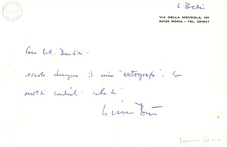 Lotto 882 Berio Luciano, Biglietto autografo firmato.