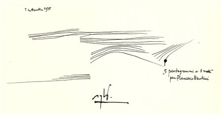 Lotto 884 Bussotti Sylvano, 1 disegno musicale siglato dal titolo '5 pentagrammi e 1 nota' e 1 biglietto autografo siglato.