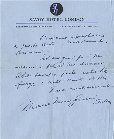 Lotto 886 Callas Maria, Lettera manoscritta firmata 'Maria Meneghini Callas' inviata ad un amico.