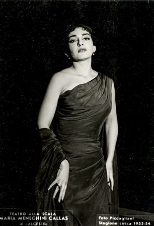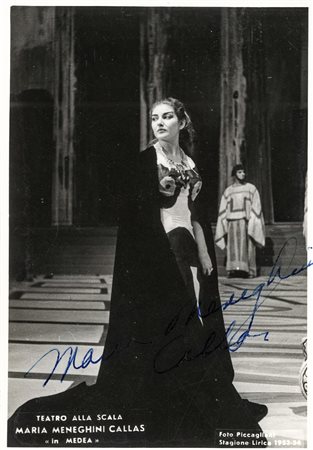 Fotografia Teatro alla Scala / […] / in Medea. Foto Piccagliani / Stagione Lirica 1953-1954. La celebre soprano è ritratta con gli abiti di scena di Medea. Firma a penna blu. Dimensioni: 145x95 mm. -