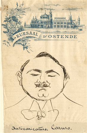 Disegno a inchiostro nero su carta con intestazione "Kursaal d'Ostende" applicato su supporto rigido (foglio d'album). Al margine inferiore dei disegni l'indicazione di altra mano: "Autocaricatura Caruso". A fianco della caricatura è conservata altra carta con firma autografa di Angelo De Gubernatis, al verso del supporto una lettera autografa di Rosina Storchio. Dimensione della caricatura: 210x130 mm. -