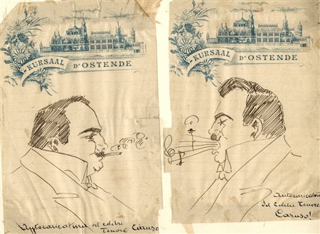 Disegni a inchiostro nero su carta con intestazione "Kursaal d'Ostende" applicati su supporto rigido (foglio d'album). Al margine inferiore dei disegni l'indicazione di altra mano: "Autocaricatura del celebre tenore Caruso". Dimensioni delle caricature: 210x130 mm circa.(2) -