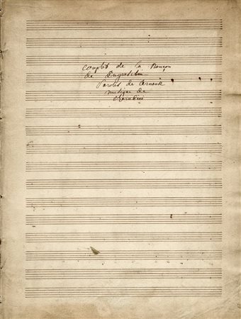 Manoscritto musicale autografo (?). Partitura. Completo. Manoscritto a inchiostro nero su carta a mano con 30 pentagrammi. Dedica autografa al frontespizio. Conservato anche il biglietto da visita del compositore. Partitura conservata in una brossura illustrata a mano. Dimensioni: 245x365 mm circa. -