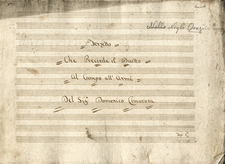 Manoscritto musicale. Completo. Partitura. Manoscritti a inchiostro nero su carta a mano con 10 pentagrammi. Aria tratta da Il matrimonio segreto. Antica nota di possesso con piccolo timbro. Dimensioni: 160x215 mm circa. SI AGGIUNGE: Sinfonia funebre / Composta espressamente / per la morte / Di S. E. il Sig. Duca di Laviano / […] / da / Ignazio D'Asti. Datato 29 ottobre 1844 Manoscritto musicale autografo. Completo. Partitura. SI AGGIUNGE: Duetto / Quella fiamma che m'accende / del Sig. Ferdinando Orland / Nella Donna soldato. Non datato [prima metà del XIX secolo]. Manoscritto musicale. Completo. Partitura.(3) -