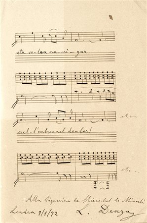 Lotto 899 Denza Luigi, Lunga citazione musicale autografa (8 battute) della romanza 'Stelle d'oro!'. Con dedica e firma.