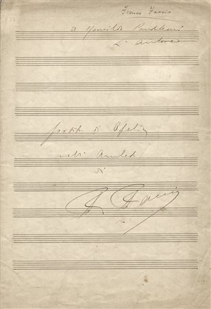 Manoscritto musicale autografo dedicato alla Pantaleoni, amante di Faccio. 6 carte, scritte 5 pagine di musica. Spartito per canto e pianoforte. Dimensioni: 290x200 mm. SI AGGIUNGE: Id., Ritratto fotografico. Dimensioni: 220x160 mm.(2) -