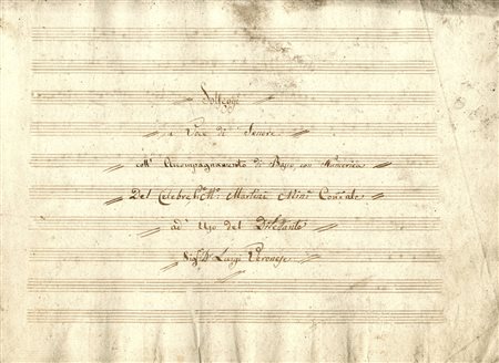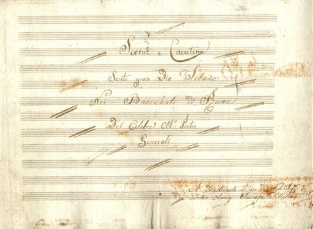 Manoscritto musicale. Completo. Partitura d'orchestra. Carte [23]. Il manoscritto è a inchiostro nero su carta a mano con 12 pentagrammi. Carte con filigrana ben conservate. Indicazione di antica proprietà alla carta del frontespizio. Dimensioni: 230x330 mm. SI AGGIUNGE: Id.,: Scena e Duetto / Quando nel Campo / […] / Nel Nuovo e Nobilissimo Teatro La Fenice. Non datato [primi anni del XIX secolo]. Partitura per Violini, Viole, Fagotti, Voci e Basso.(2) -