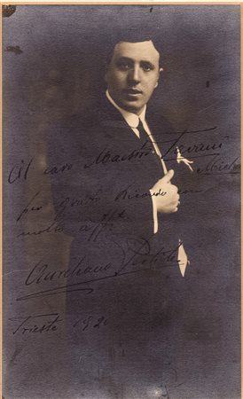 Dedica a inchiostro bianco. In cornice. Dimensioni: 420x330 mm. SI AGGIUNGE: 1 ritratto fotografico di Aureliano Pertile con fotografico con dedica e firma autografa. Datato Trieste 1920 (in cornice) e due ritratti su cartolina di Lina Bruna Rasa con dedica e firma autografa datati 1925 e 1927. Dimensioni varie.(2) -
