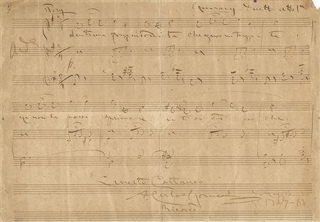 Manoscritto a inchiostro nero su carta pentagrammata. 1 carta, scritta al recto. Citazione tratta dal primo atto dell'opera (Duetto). Con dedica ad Ernesto Cattaneo. Dimensioni: 205x295 mm. SI AGGIUNGE: Id., Biglietto autografo firmato con busta (quest’ultima scritta da altra mano). Non datato. Testo in francese.(2) -