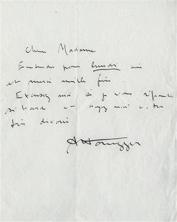Manoscritto a inchiostro nero. 1 carta, scritto il recto. Su carta intestata del compositore. Al verso timbro ad inchiostro di collezionista. Dimensioni: 140x220 mm. -