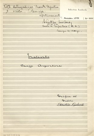 Lotto 910 Lombardo Sebastian, Malambo / Danza Argentina […]. Con dedica autografa al direttore d'orchestra Ettore Panizza.