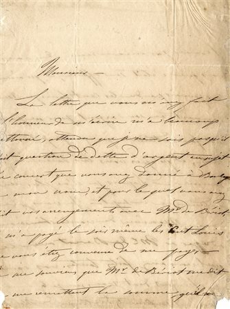 Manoscritto a inchiostro nero. 1 bifolio, scritta 1 pagina. Testo in francese. Una mancanza della carta a motivo dell'umidita al margine superiore destro. Senza perdita di testo. Dimensioni: 257x205 mm. -