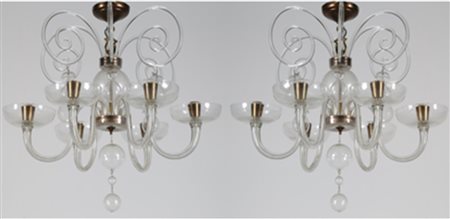 SCARPA CARLO (1906 - 1978) Pair of transparent glass and lattimo chandeliers, with six lights and brass details, for Venini Murano, 40’s. Literature; Venini. A. Venini Diaz De Santilliana’s Ragionato catalog 1921-1986, ed. Skira, blue catalog pag. 264, num. 5315f. fig.181; G.P. 1940, pag. 58; Barovier 1997, 1997 pag. 278 n.34. . . Cm 65,00 x 90,00 x 65,00. -