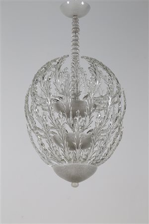 BAROVIER ERCOLE (1889 - 1974) Glass chandelier with transparent crystal leaves, for Barovier and Toso, 30’s. The same model was used by the architect Melchiorre Bega for the bakery bar Majani’s furnitures in Bologna in 1939, Literature; same model Domus num. 146 february 1940 pag. 87. . . Cm 65,00 x 115,00 x 65,00. -