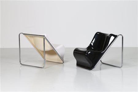 ROSSELLI ALBERTO (1921 - 1976) Pair of chromed metal and plastic deckchairs, mod. P110 for Saporiti 70’s. Literature; Rassegna modi di abitare oggi: bimonthly magazine, semptember/december 1972 pag. 39/40. . . Cm 75,00 x 65,00 x 69,00. -