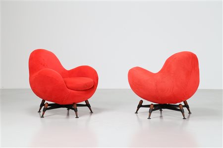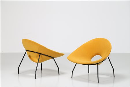 Lotto 85 MENGHI ROBERTO (1920 - 2006) Coppia di poltrone in metallo stampato, imbottitura in gommapiuma, mod. Hall, per Arflex, anni 50. Pubblicazione; G. Gramigna, Repertorio 1950-1980, Mondadori, 1985, pag. 119 . -. Cm 98,00 x 83,00 x 86,00.