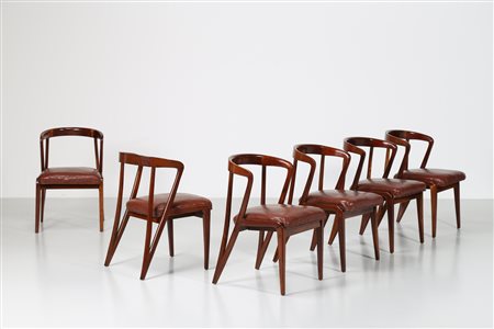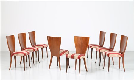Lotto 80 BEGA MELCHIORRE (1898 - 1976) Otto sedie in palissandro e tessuto, per dimora in Bologna, produzione Vittorio Bega e Figli, anni 40. -. Cm 43,50 x 87,50 x 53,00.